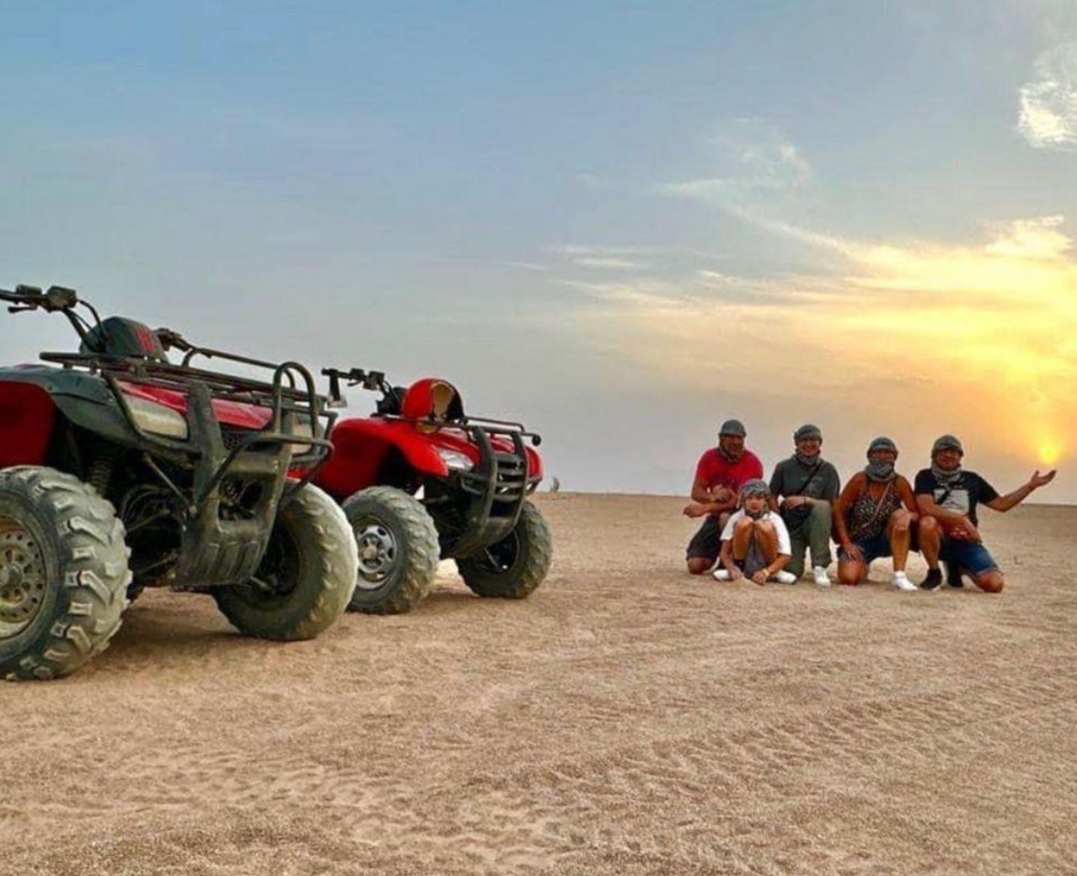 Quad driving for around 22 km , including 1 stop for break and 1 stop in a Bedouin village to ride camels and drink Bedouin tea , then drive back 22 km to our quad station then open buffet dinner with barbecue, then oriantal show ( belly dancer , tanoura show , folklore show and fire show )
